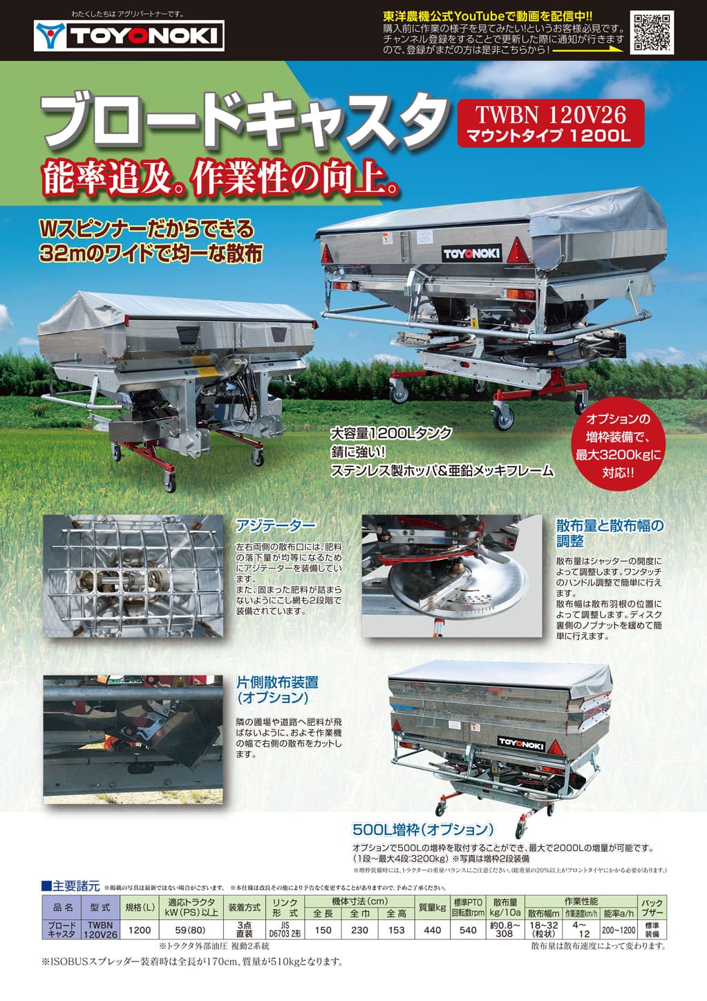 ブロードキャスタは、粒子状の肥料・牧草の種子等を全面散布する機械です。ステンレスホッパを有し、ホッパ下部の羽根車(スピンナー)の回転によって、材料は遠心方向に水平に散布されます。